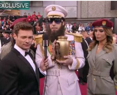 Getting “Punk’d” is so last year. Last night, Ryan Seacrest found himself in the crosshairs of prankster Sacha Baron Cohen. Dressed as a character from his new movie—King Aladeen—Cohen was carrying an urn, which held the ashes of “his late doubles partner” Kim Jong Il, as he stopped to chat on the Oscars red carpet. The Borat star was happy to chat with Seacrest when he stopped him, and Seacrest looked happy too—until Cohen suddenly dumped the urn all over Seacret’s tuxedo. Seacrest handled it well but was clearly not interested in laughing along with the prank. VIDEO
