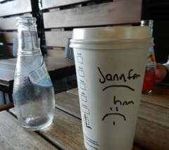 Today’s Alter Ego comes from Jennifer, who was puzzled not only by the spelling of her name also by the emoticon her cup received: “No idea why I got the frownie face either….I was in a great mood and was very pleasant to barista.”