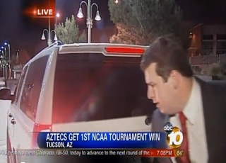 In case you missed this one as it made the rounds on the weekend, San Diego sports reporter Ben Higgins was almost run down on live TV on Friday night. He was doing a live report for KGTV from the site of an NCAA basketball game in Tucson when a van started backing up toward him.