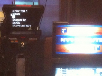 The broadcast script for the NY1 Minute said “Snagged by Spider-Man.” When we were pre-recording the headline segment this morning that’s not quite how I delivered it.