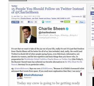 Prompted by his continuing spiral into belligerence, the Village Voice has proposed a national holiday: Unfollow Charlie Sheen Day. Twitter users are being asked to check out of the star’s feed on Friday, March 11 because “freedom from Charlie Sheen will be better for all of us, him included.” I was happy to note I was among the 15 people they recommended following instead.