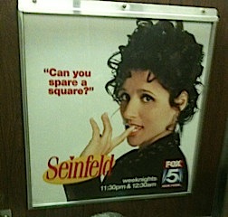 One of the joys of living in New York is seeing the little details you’ve memorized from “Seinfeld” slip into your day-to-day life. My first New York City apartment, like Jerry’s, was 5A. And the real Kenny Rogers Roasters store with the bright neon sign was at the end of our block. So I had to chuckle when I read on the Huffington Post this morning that one “superfan” took a Sharpie to several “Seinfeld” posters hanging in the subway.