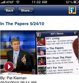 If you’ve got an iPhone, you can take NY1 on the road with you now. The NY1 News app was unveiled today in the iTunes app store. It delivers text and video versions of the top stories and up-to-date weather forecasts. But I have decided the most important feature is that you can view my New York City “In the Papers” segment from anywhere.