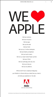 The full-page ad in the New York Times and Wall Street Journal says “We (heart) Apple.” But it doesn’t seem like there’s much love behind this shot at Apple’s anti-Flash policy for the iPhone and iPad.