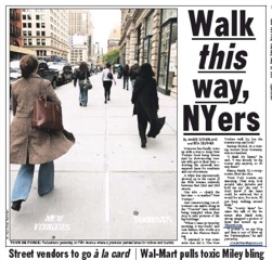 Attention Tourists: We have a city to run here, so get out of the fast lane. A line has been drawn in the sidewalk leading New Yorkers to the left, and tourists to the right. Some anonymous artists divided a section of Fifth Avenue with a white line down the middle of the sidewalk between 22nd and 23rd streets.
