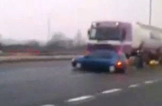 I saw a stunning video this morning of a car that was somehow pushed by a truck down a UK highway at 60 miles per hour. The footage was shot by a passenger in a neighboring car. According to the Guardian, the woman driving the car suffered no injuries. She says she hesitated using her cell phone to call emergency services because it wasn’t a handheld device but says she figured it was ok because she wasn’t really “driving” her car. VIDEO