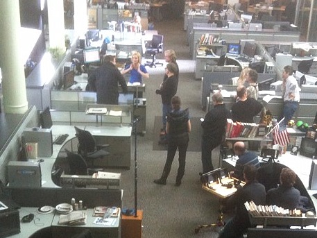 I can’t give away script specifics. But so far one of the funniest things to happen in the newsroom was this: