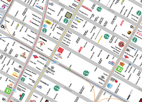 I was impressed with the website when I spent a few minutes with it this morning. It was easy to navigate, and very accurate for the neighborhoods where my mental map was able to act as a check. And visually it confirmed something that New Yorkers already knew: there are a lot of Starbucks and Duane Reade locations in midtown Manhattan.