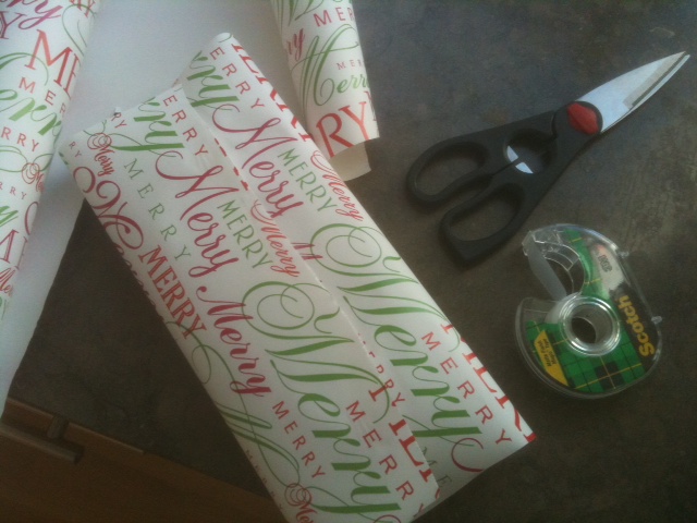 Somehow we ended up with some really fancy, thick Christmas wrapping paper. It’s impossible to work with. Give me the cheap stuff any day.