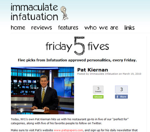 The New York City restaurant review site Immaculate Infatuation asked me for restaurant picks in five categories. Among my favorites: the “serious take-out operation” at Chirping Chicken and the excellent Bacon Spinach Tomato pizza at Freddie & Peppers. (I had it today for lunch.)