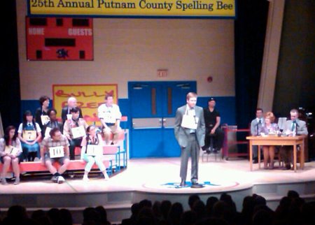 I was called from my seat, along with the other audience spellers, just a few minutes into the opening act. We took our places in the bleachers and the spelling bee began. Mostly, our role was to stay out of the way of the comedy and spell a few words when necessary. We weren?t given the words or prepped in any way, but the contest is clearly engineered to at least make sure that everyone gets one right answer before being sent back to the audience. ?Canadian? was the first word I faced. My answer was correct.