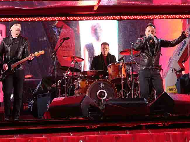With U2’s Bono still recovering from his Central Park bicycle crash, Bruce Springsteen and Chris Martin filled in at the World AIDS Day concert in Times Square.