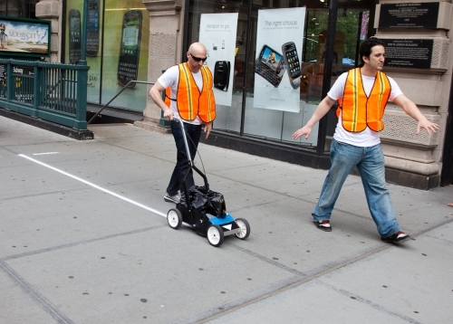 A few weeks ago, I shared the story about the gag “tourist” and “New Yorker” sidewalk lane markers that mysteriously appeared on a New York City sidewalk. Now the improv team behind the prank has come forward, with a video clip and photos of how it was done.