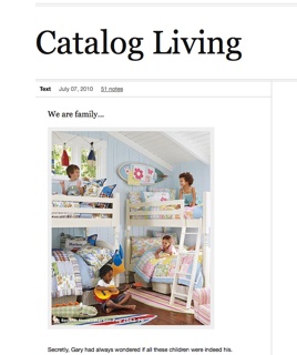 In the spirit of Awkward Family Photos, the people at Catalog Living have dipped their pens in sarcasm to dissect the seemingly flawless lifestyles that are delivered to American doorsteps via mail-order catalogs. Apparently, it’s the creation of a LA-based comedienne and, I’ve got to say the results are pretty funny. A little poking around on the site reveals that Pottery Barn is by far and away the biggest source of material. It happens to be a Pottery Barn photo of a highly styled entryway that inspired my favorite captions. It reads, “Our entryway set-up is great! Now I never forget my hat, burlap satchel, or life preserver.”
