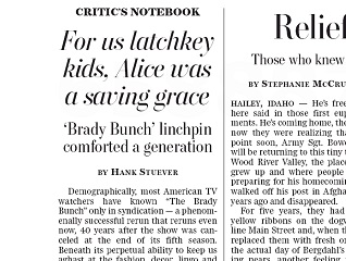 The Washington Post’s Hank Stuever uses the occasion of Ann B. Davis’ death to brilliantly make a case that the Brady Bunch was a connector of a generation. He says the show, and in particular Alice the housekeeper, was a blessing for latchkey kids like him. Alice was always there to fill the needs that Florence Henderson, and maybe even our own mothers at times, could not.