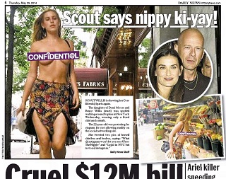 Scout Willis has launched an offensive against Instagram’s nudity policy. The Daily News says the 22-year-old daughter of Bruce Willis and Demi Moore tweeted topless photos of herself strolling around Manhattan. She captioned one “What @Instagram won’t let you see #FreeTheNipple.” Her protest came after Instagram removed one of her photos for violating its community guidelines.