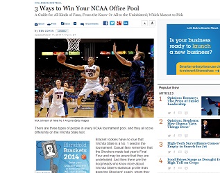The Wall Street Journal’s Ben Cohen has some helpful advice on how to win your office NCAA Tournament pool. He breaks it down into three levels of fans. For the novice, he says, pick the favorites. Intermediates should focus on which teams have the best players and advanced players should pay attention to a team’s pace. Slower teams have fewer chances to make up for mistakes.