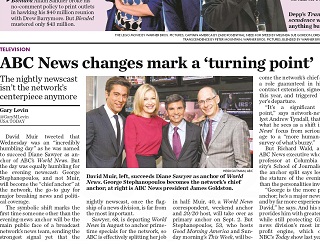 ABC made big news when it announced David Muir would replace Diane Sawyer as host of World News. But perhaps more important, was the announcement that George Stephanopoulos, not Muir, would be the network’s “chief anchor” to be relied upon in the event of breaking news and major political coverage. USA Today’s Gary Levin says it marks the first time that someone other than the evening news anchor will be the main face of a network news team. Levin says it’s the strongest signal yet that the flagship evening newscast is no longer the most important.