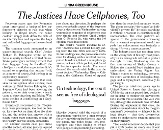 In a New York Times Op-Ed piece, Linda Greenhouse writes of the Supreme Court’s 9-0 decision in favor of cellphone privacy. She says in cases involving technology, “the court seems free of ideological baggage and is trying hard, collectively, to get it right.” She says the big difference in this case as opposed to other search and seizure cases is that Supreme Court Justices have cellphones too, and they could just as easily be searched by law enforcement.