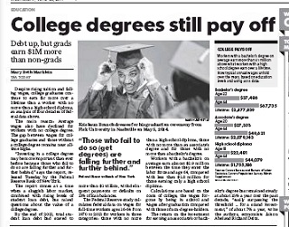 Even with rising tuition costs and falling wages, data suggest college graduates will go on to earn far more over their lifetime than a worker with only a high school diploma. USA Today says the main reason is that average wages for those without college degrees have fallen as well. Over the past 40 years, those with a bachelor’s degree generally earned 56% more than high school graduates.