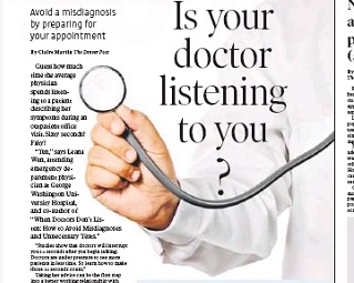 The Denver Post has some advice on how to avoid a misdiagnosis by making sure your doctor is listening to you at your next appointment. The average doctor listens to a patient for just ten seconds during a typical outpatient visit. It’s important to make that time count. Your best bet is to think through in advance what you want to tell the doctor, including when you first noticed the problem you’re having, what you were doing before it happened, have you been using pain relievers, etc.