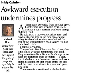 Milwaukee Journal-Sentinel columnist Michael Hunt says the awkward way the Bucks went about hiring Jason Kidd away from the Brooklyn Nets undermines a sense of trust and credibility that the team’s new ownership group has been trying to build in Milwaukee. The owners went behind the general manager’s back to court Kidd, then put the GM in the awkward position of having to negotiate the terms of the deal with Nets’ GM Billy King, whom Kidd had tried to undermine in a power play in Brooklyn.