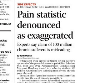There’s an oft-cited statistic that 100 million Americans (or about 40% of the adult population) suffer from severe chronic pain. But according to the Milwaukee Journal Sentinel, experts say that figure is exaggerated and misleading. The paper found that of the 19 members of the Congressional panel that came up with the statistic, 9 had close ties to the narcotic drug industry. Experts say in reality, only about 20% to 25% of adults are substantially impaired by chronic pain and only half of them can’t work because of it.