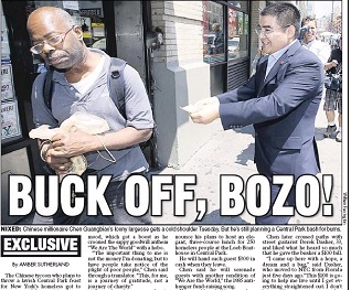 Chinese recycling tycoon Chen Guangbiao is planning to treat 1000 homeless New Yorkers to lunch in the swanky Central Park Boathouse restaurant. After lunch, he’ll hand each attendee $300 in cash. He says he wants to inspire others and prove that Chinese people are generous. But not everyone wants his money. The New York Post caught Guangbiao trying to hand a $100 bill to a homeless man who brushed him off. The South China Morning Post says Guangbiao is also known for his habit of singing “We Are the World” which he plans to do at his series of free lunches. VIDEO