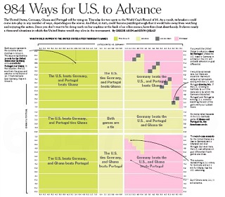 If you’re watching today’s USA/Germany World Cup match, you don’t want to be doing math to figure out whether the US will advance depending on what happens in their game and the simultaneous Portugal/Ghana game. So the New York Times’ Upshot column broke down 984 scenarios in which the US could advance to the round of 16 and put them into a handy interactive table.