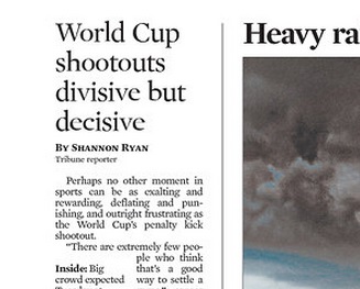 Once the World Cup reaches the knockout stage, if no one wins after 90 minutes of regulation and 30 minutes of overtime, the game goes to a shootout. So far two of the six games played in this round has been decided by a shootout. The Chicago Tribune says few fans actually like the shootout, but no one has come up with a better way to determine a winner.