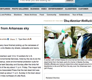 In one Arkansas town, 2011 started off in a very Hitchcockian fashion. According to the Baxter Bulletin, scientists are trying to figure out what caused two thousand dead birds to drop from the sky on New Years Eve. The two most popular theories of what happened involved fireworks and hail. The red-winged blackbirds started dropping from the sky at about 11pm on New Year’s Eve. It took sanitation workers several days to clean them all up. After investigating a nearby roosting area and finding it free of dead birds, officials have ruled out some sort of avian plague. But the real cause remains a mystery.