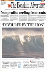 Surf’s up in Hawaii - way up. I was struck by this picture of surfers enjoying 50 foot waves. I was struck by this picture of surfers enjoying 50 foot waves. The Honolulu Advertiser writes that the waves might be big enough for the Eddie Aikau big wave surf contest at Waimea Bay. The contest “is held only when there are surfable waves with 40-foot faces (or about 20-foot waves measured Hawaiian-style, from the back of the wave)” and was last held in 2004.