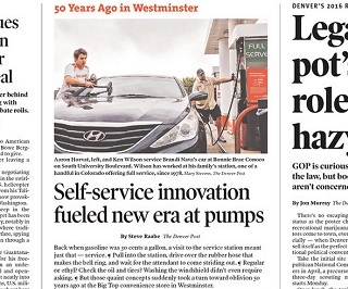 The Denver Post marks the 50th anniversary this week of the first self-service gas station in Westminster, Colorado. The owner of the station, John Roscoe, found he could draw customers to the new experience by charging 2 to 3 cents per gallon below what the full service stations charged. It took a decade for full service gas to really catch on - and even today, customers in Oregon and New Jersey are still banned from pumping their own gas.