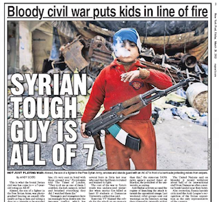 The AK-47-carrying, cigarette-smoking tough guy in the New York Post this morning is actually a seven-year-old kid. Ahmed is the son of a Syrian rebel. The photo was taken by New York-based photographer Sebastiano Piccolomini, who says the country’s bloody civil war has put children on the front lines.