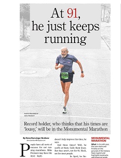 91-year-old Mike Fremont will be running in the Indianapolis Half Marathon this weekend. The Indianapolis Star says despite being the world record holder for his 3:03:56 half marathon in Knoxville this year, Fremont scoffs at his times, calling them “lousy.” Fremont says he doesn’t care much about setting records, he just likes to run.