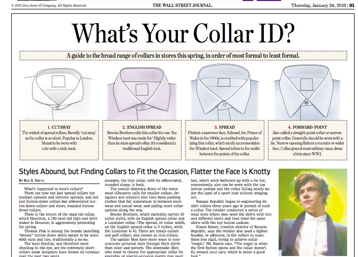 What’s your collar ID? There are so many different types these days (Brooks Brothers carries 10) that the Wall Street Journal felt it necessary to explain them all this morning. A preview: The cutaway is the widest of all styles and is meant to be worn with a wide-knotted tie. The snap tab has a little…snap tab to keep your collar points in line, and is reemerging from its heyday in the 1920s and 30s as a fashionable choice.