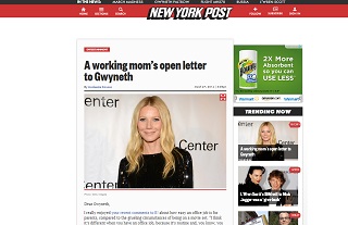 Gwyneth Paltrow ruffled a few feathers when she said in an interview with E! that being an actress is so much harder than being a regular working mom. Working mom Mackenzie Dawson responds with an open letter in the New York Post. She says she tells herself almost every day, “thank God I don’t make millions of dollars filming one movie a year!” She goes on to mention how easy it is to balance work and home life, what with reliable babysitters readily available, as opposed to the drag of having your own staff.