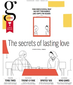 The Super Bowl is over and newspapers have shifted their coverage to the next big holiday—bring on the Valentine’s Day stories. Today, the Boston Globe interviews four couples who’ve been married for fifty years or more. Each offers their own recipe for relationship longevity. The article is worth it simply for the stories of how these couples met, but I particularly liked the way one gentleman summed up his philosophy on marriage: “If you married properly, you just begin to accept the obligations you have. Both of you are working together to accomplish something. You don’t sit back and say, this isn’t my responsibility. It becomes love in a different sense.”