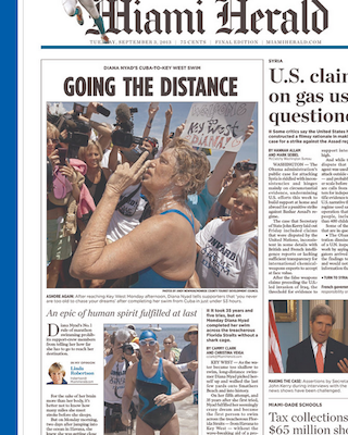 The big photo on the front page of the Miami Herald is of Diana Nyad after completing her historic swim from Cuba to Key West. Honestly, after all of the times we covered her NOT making it, I wasn’t paying a lot of attention until she actually got close to the end. And it’s a nice story of serious determination and triumph. The 110-mile swim took 52 hours, 54 minutes and 18.6 seconds to complete and left 64-year-old Nyad bruised and swollen.