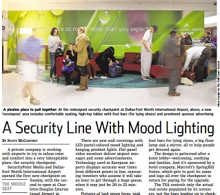 There’s an effort underway to bring some sense of calm and comfort to the typically chaotic airport security areas. The Wall Street Journal says security lines at Dallas-Fort Worth and Charlotte-Douglas Airports now feature mood lighting and music meant to instill a sense of calm. Information screens will tell passengers how long they’ll be waiting. And once you get through security, you can sit on a leather couch to put your shoes and belt back on.