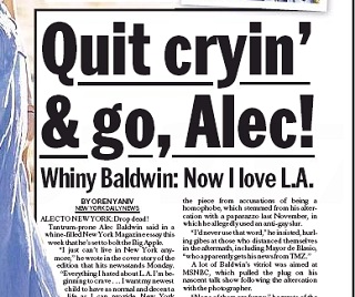 The New York Daily News says Alec Baldwin is once again threatening to leave New York. In a New York Magazine cover story, the “30 Rock” star says the paparazzi have made it impossible to raise a family in the city. Baldwin says he now craves the privacy of Los Angeles. He also railed against MSNBC, which dropped his talk show after he allegedly used an anti-gay slur on a photographer.