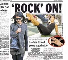 Alec Baldwin got engaged on the weekend to 28-year-old “yoga hottie” Hilaria Thomas says the New York Daily News. Baldwin went off on Twitter last night on the paper over its efforts to get a photo of the ring from inside her yoga class. They succeeded and describe the diamond as ““huge, very clear, perfect clarity, Cartier.” Scroll down to see a selection of Baldwin’s posts: