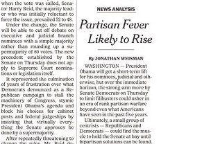In the New York Times, Jonathan Weisman suggests Republicans will be looking for revenge now that Senate Democrats have moved to limit filibusters. President Obama will get a short-term lift from the confirmation of his nominees. But Weisman says Republicans will be eager to prove they still have power and will likely unite against the Democrats.