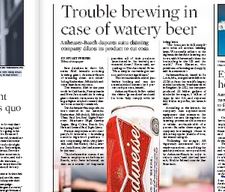 Beer drinkers are taking their complaints to court says the Chicago Tribune. Lawsuits in three states haves been filed against Anheuser-Busch for watering down their brew to cut costs. The company has been accused of listing a higher alcohol content on ten of its iconic brands, including Budweiser and Michelob, and the Tribune says some high-level former employees are cooperating with the plaintiffs.