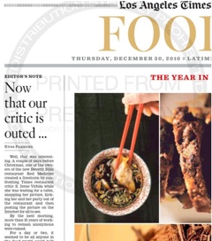 All that foodies in California have been talking about this week is the very public outing of the LA Times food critic by local restaurant owners a few days before Christmas. Today, the Times turns the brew-ha-ha into a debate on the merits of anonymity in the restaurant review business. In UK and France, newspaper restaurant critics don’t hide the identity the way they do in the US. In fact, most critics are very visible celebrities. And some people say that’s a good thing because it puts every restaurant—from the smallest mom and pop operation to high end emporiums—on equal footing.