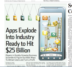 The apps industry is exploding, says the Wall Street Journal this morning. There are more than 700,000 apps for sale in Apple’s marketplace, and it’s believed that people spend around two hours a day plugged into at least one app. Expected to hit $25 billion in global revenue this year, one analyst likens the industry to “cars at the turn of the last century.”