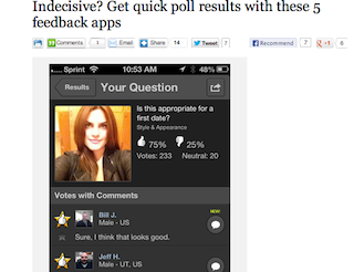 If indecision rules most days for you, the LA Times says the latest crop of apps to hit the market might be of interest. Capitalizing on the thrill of “real-time polling and the instant gratification that comes from the approval of strangers,” several new companies have created apps that let you ask strangers if you, say, look fat in those jeans. Or whether to have steak or seafood for dinner.