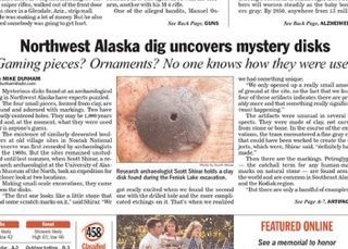 An archaeological dig in Alaska has turned up a mystery, reports the Anchorage Daily News this morning. Four small clay discs were discovered on the dig, two with small holes drilled in the center. Scientists estimate that the objects are about 1000 years old; what they can’t figure out is what the heck they are. Guesses run the gamut: gaming pieces, jewelry, pottery—no one is quite sure. Adding to the confusion are several human-made markings, which, depending on who you ask, could be maps or a storytelling or mystical symbols or just decoration.