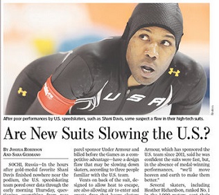 With American speedskaters struggling in Sochi, the Wall Street Journal says team officials have identified a possible culprit: New, high-tech racing suits manufactured by Under Armour. Vents on the back of the suit designed to allow heat to escape are also allowing air in, creating drag. Under Armour says the suits were wind tunnel tested and designed by Lockheed Martin engineers.