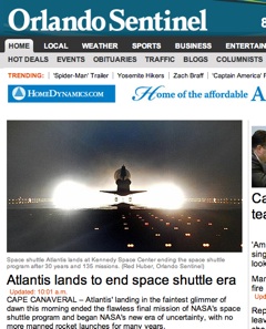 The shuttle Atlantis touched down at 5:56 this morning, marking the end of NASA’s 30-year program. The Orlando Sentinel says “in the faintest glimmer of dawn” Commander Chris Ferguson steered the shuttle to a “flawless” landing. Ferguson thanked the other iconic shuttles—Columbia, Challenger, Discovery, Endeavour—and the one he piloted “for protecting us and bringing this program to such a fitting end.” VIDEO